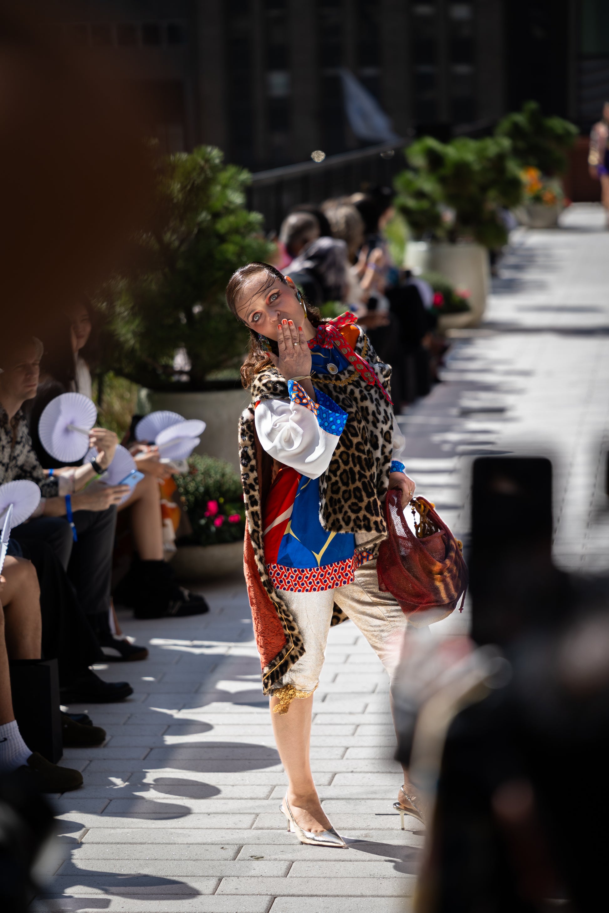 The asymmetric top can be styled in multiple ways — as a cape, blouse, or festival layer — giving endless versatility. Paired with matching pants, the look balances drama and comfort, transforming opera couture into street-ready fashion.