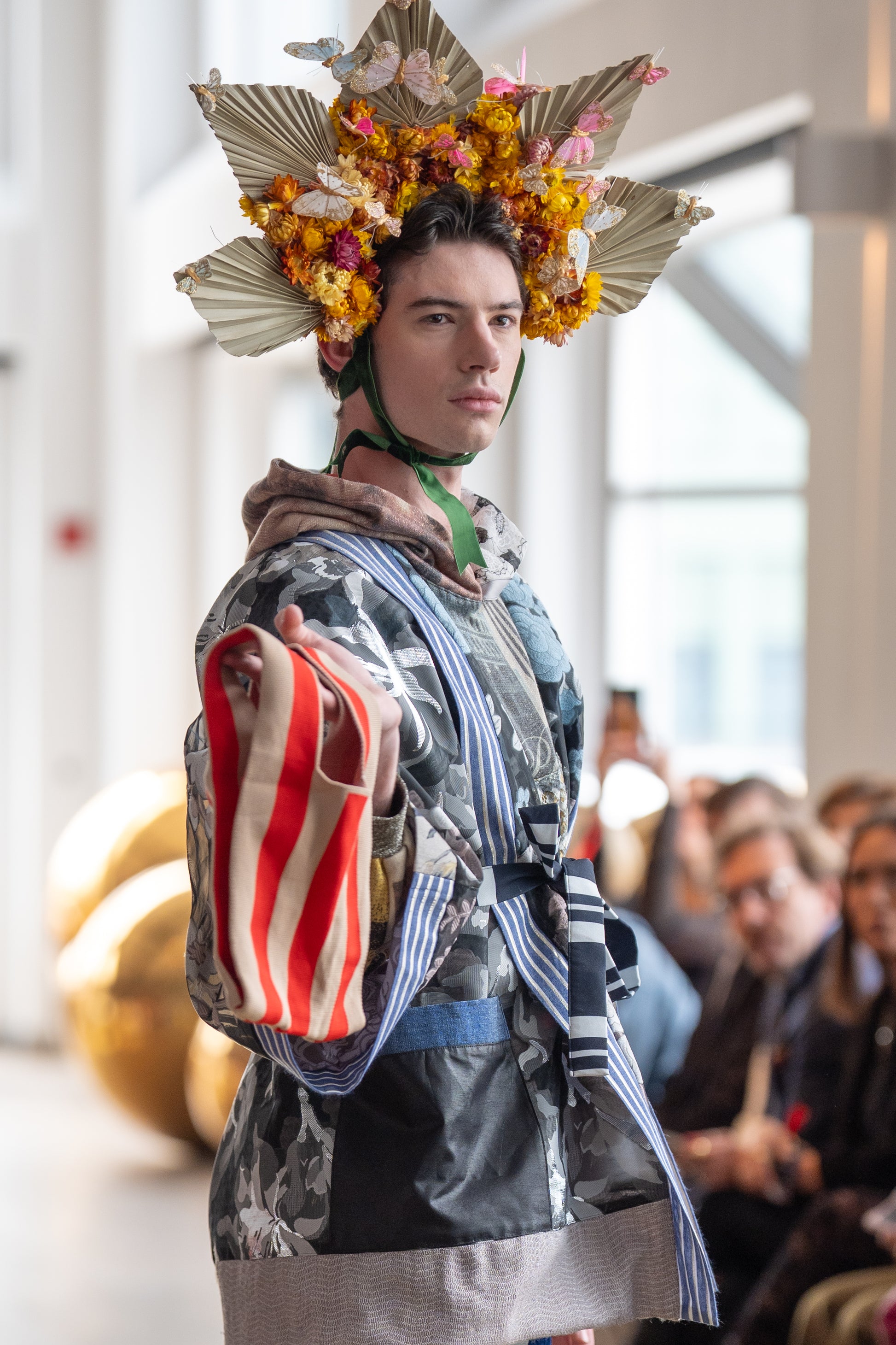 The design language moves between geometric patterns and floral motifs. Some pieces feature clean architectural lines and rhythmic symmetry. Others explore abstract blossoms and graphic petals in a bold, stylized composition. The aesthetic feels like editorial face art translated into textile — expressive yet controlled.