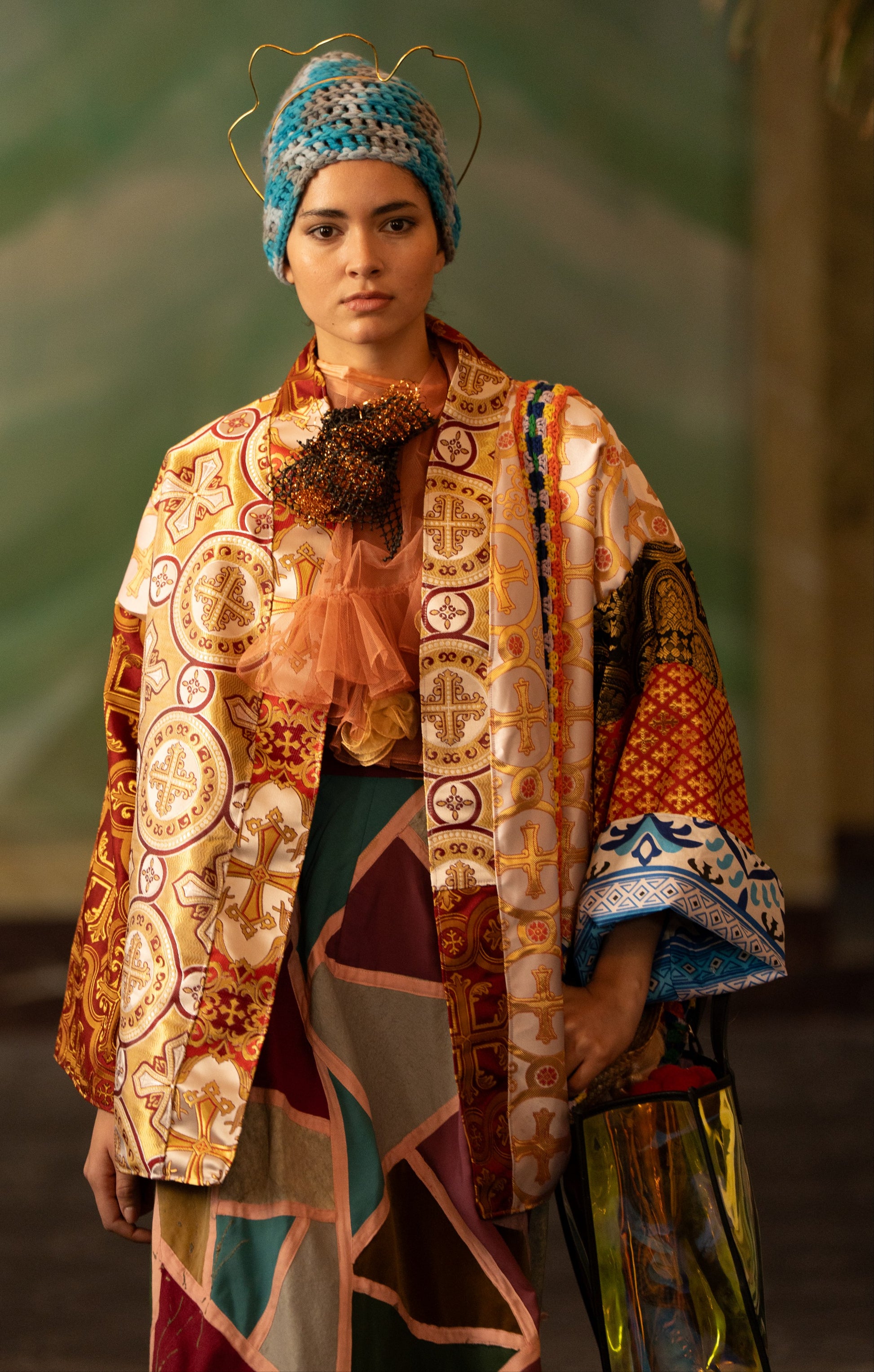 The piece sits like a sculptural extension of the body.