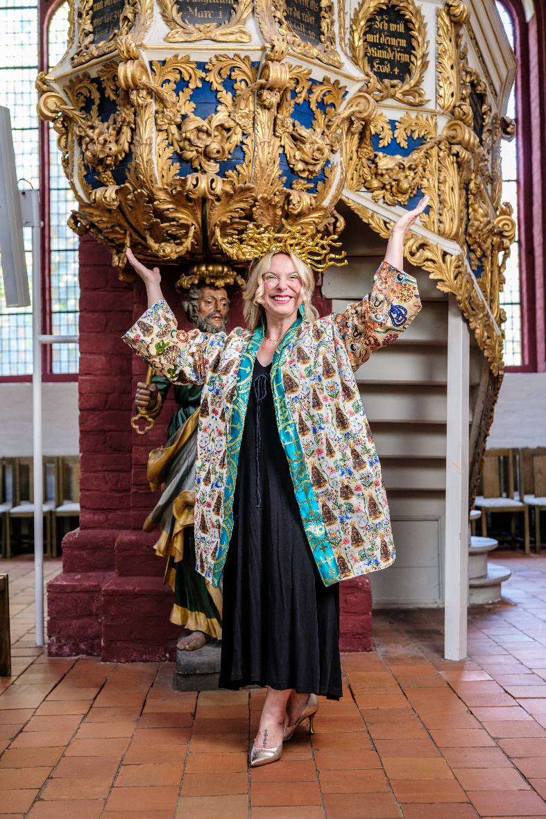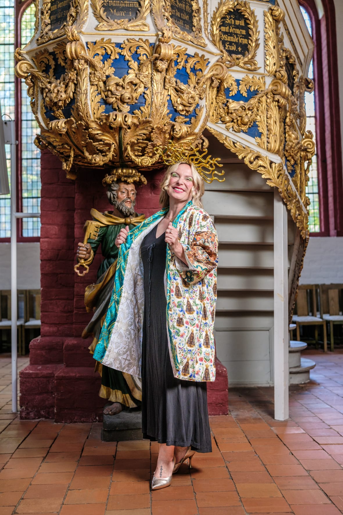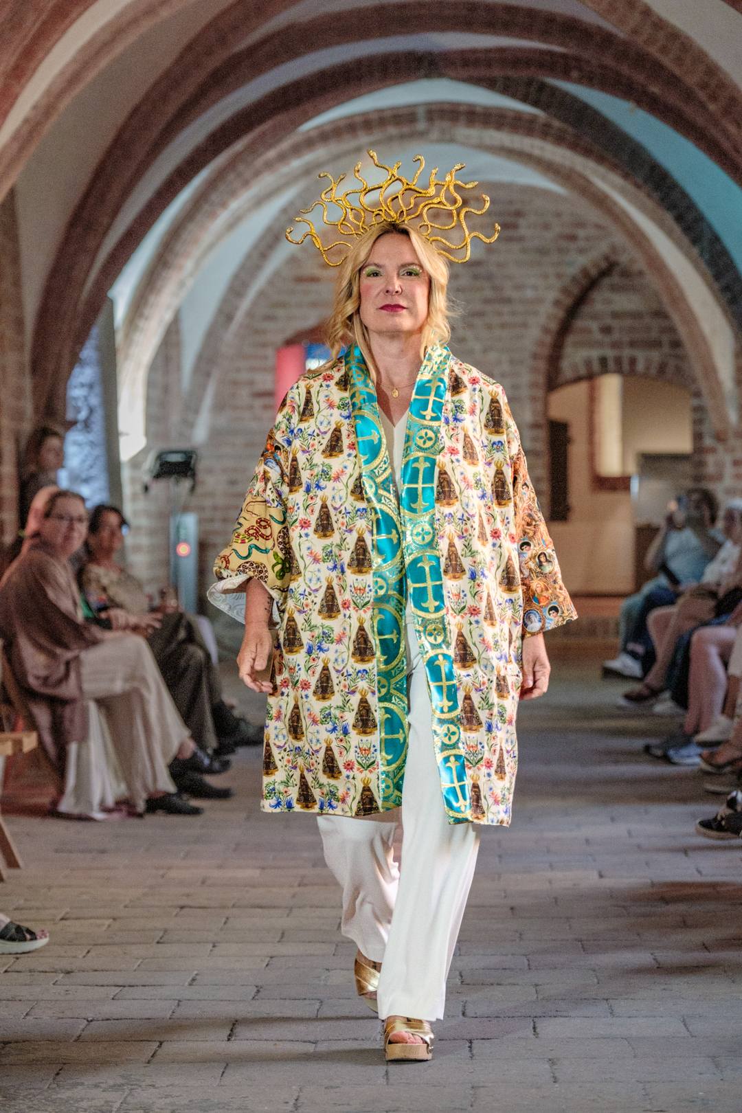 Designed as one size fits all, this upcycled ceremonial piece was presented at both the Brisbane Fashion Week with Ravishing Fashionistas and in the Cathedral of St. Peter and Paul in Brandenburg an der Havel — uniting the worlds of faith, art, and sustainable couture.