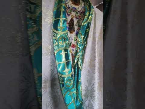 A spiritual masterpiece woven from devotion and artistry. This sacred kimono is crafted from holy liturgical fabrics — a pure white brocade from Brazil symbolizing light and purity, and a shimmering turquoise textile from Peru evoking divine serenity and celestial beauty.