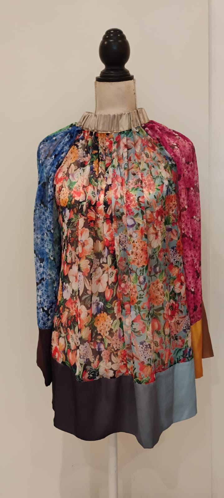 A luminous ode to spring and femininity. This transparent blouse, crafted from a luxurious blend of viscose and silk satin, features colorful floral motifs that evoke lightness, joy, and renewal.