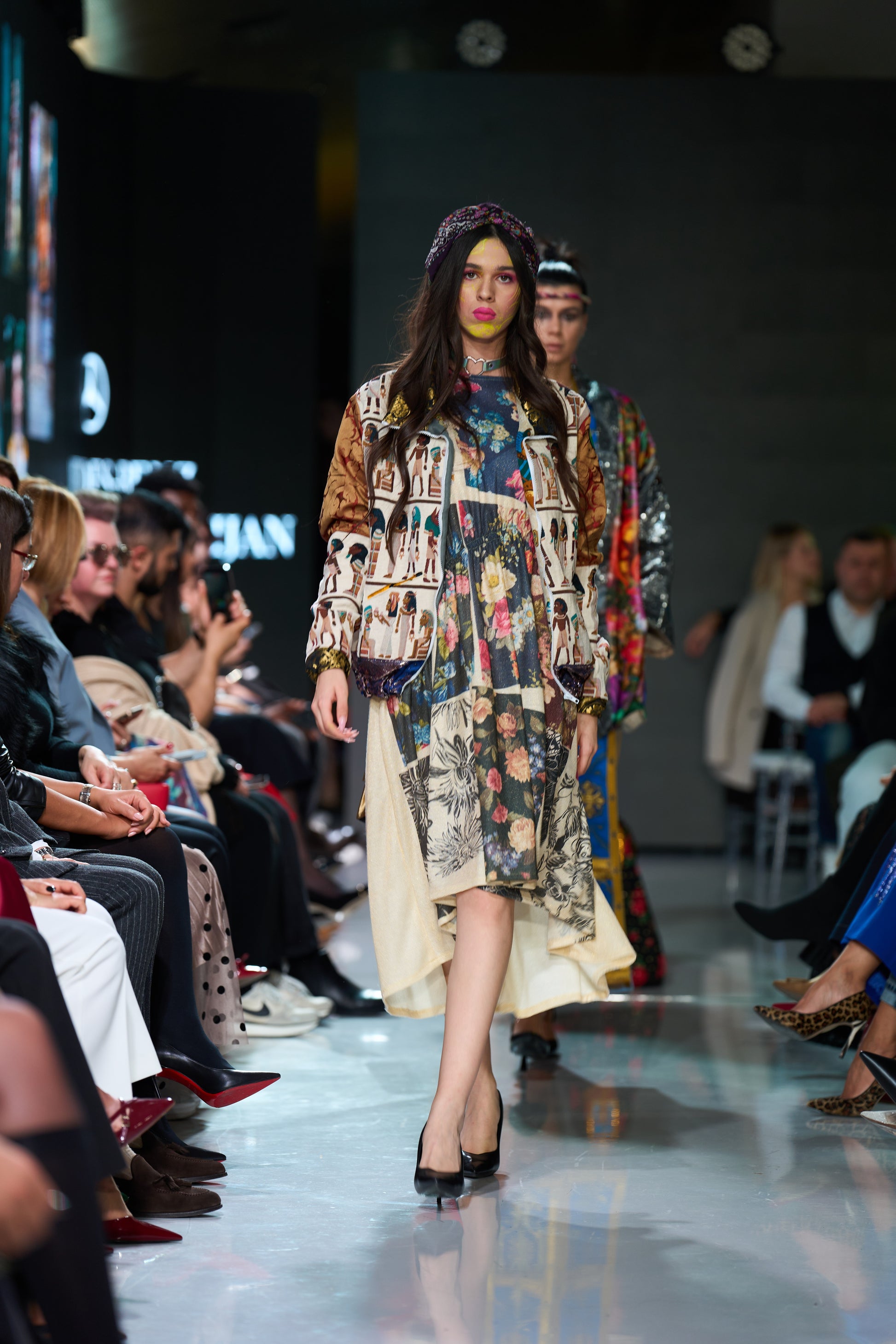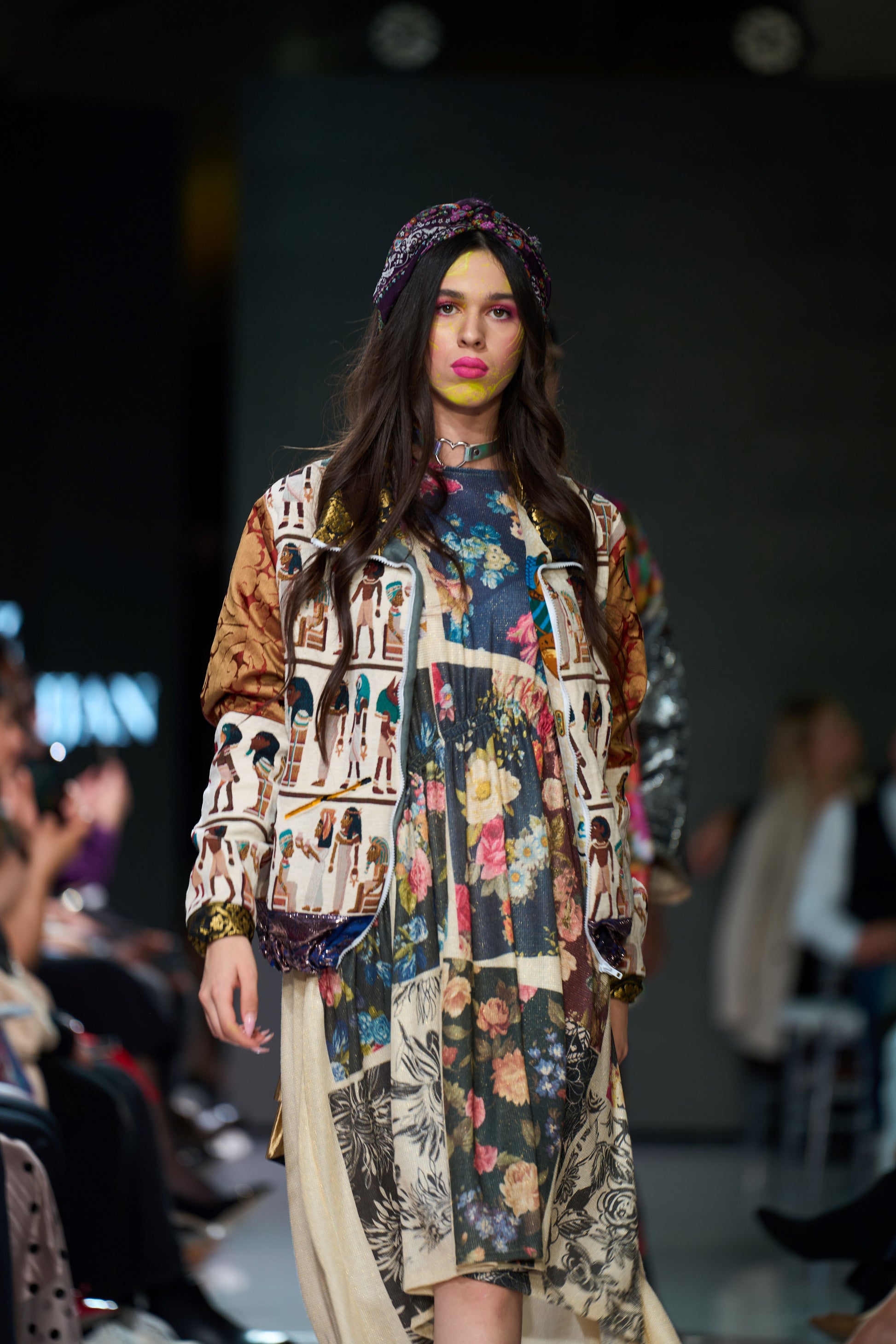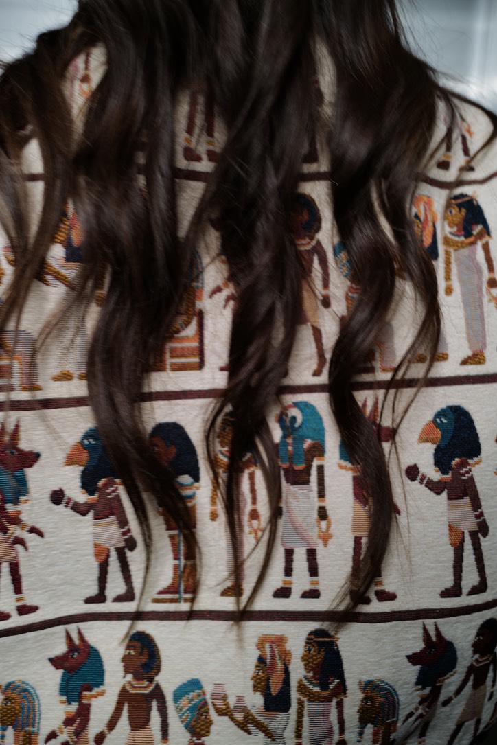 The inner lining is a thinner cotton fabric, also decorated with pharaonic motifs, sourced in Barcelona. This lighter layer brings movement and contrast, creating an interplay between weight and softness, exterior authority and interior intimacy. Collar and zipper give the piece a clear, contemporary frame while maintaining its couture character.