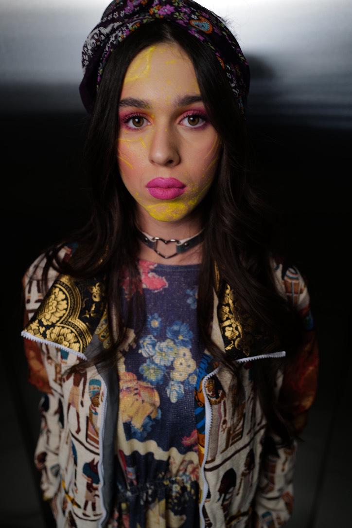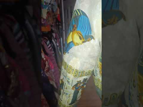 Key takeaways: reversible couture jacket, Greek Orthodox woven cotton brocade with pharaonic faces on the outside, lighter pharaonic cotton lining sourced in Barcelona, collar and zipper, one size fits all, fits sizes 36–40.