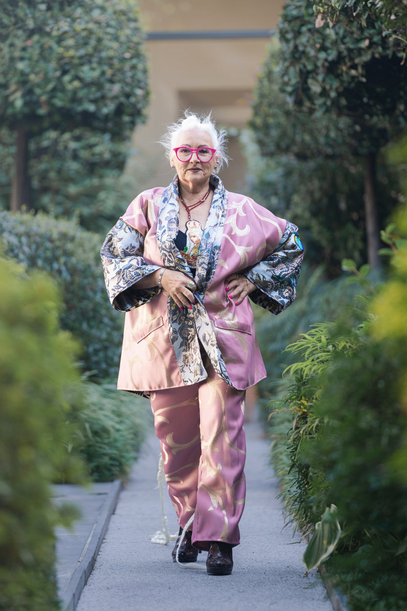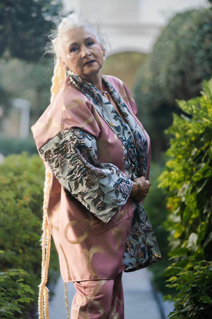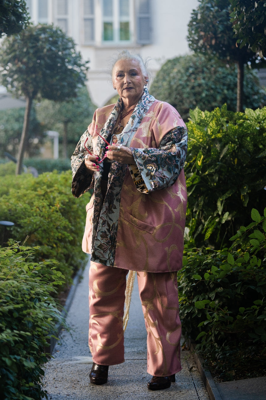 Pink & Gold Brocade Ensemble – Kimono Top and Pants | Milano Fashion Week 2025