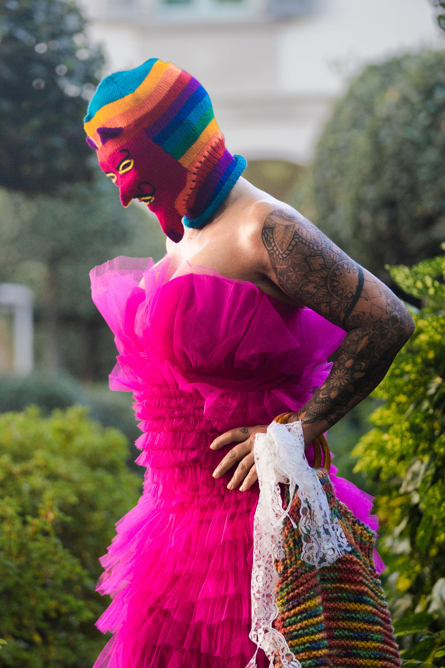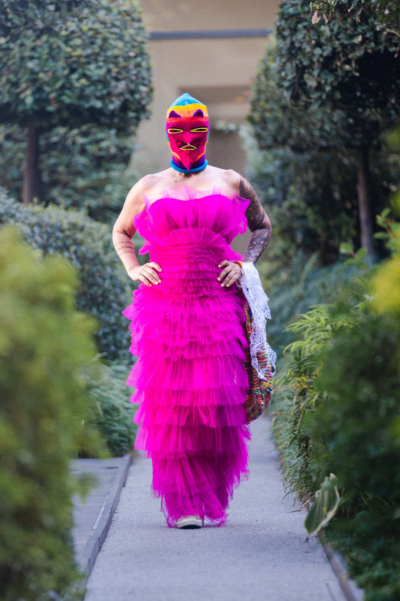 Daring, bold, and unapologetically glamorous. This flamboyant pink ruffle dress, originally from Auckland, New Zealand, has been upcycled by Paulina’s Friends into a radiant piece of avant-garde fashion that celebrates freedom, confidence, and individuality.