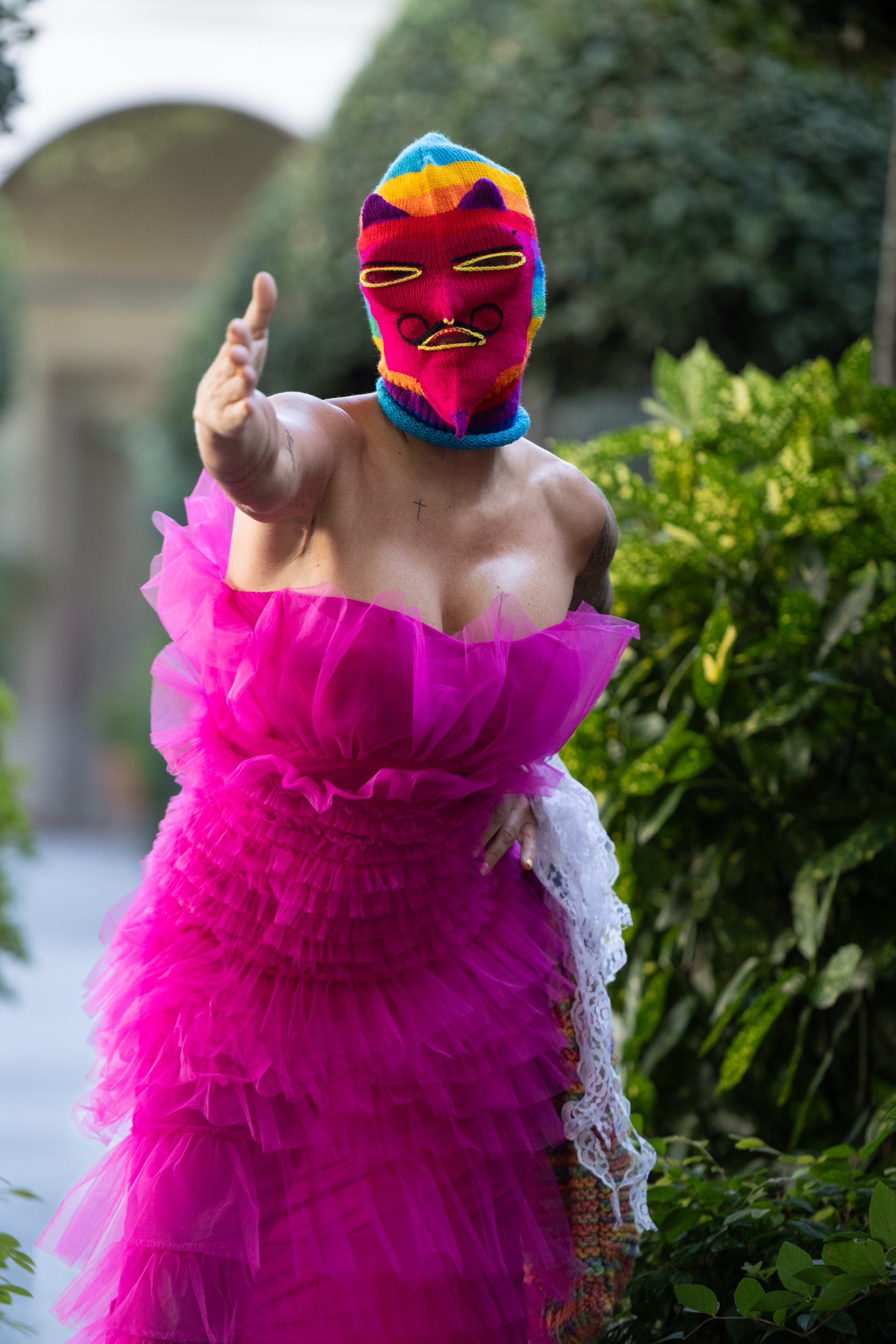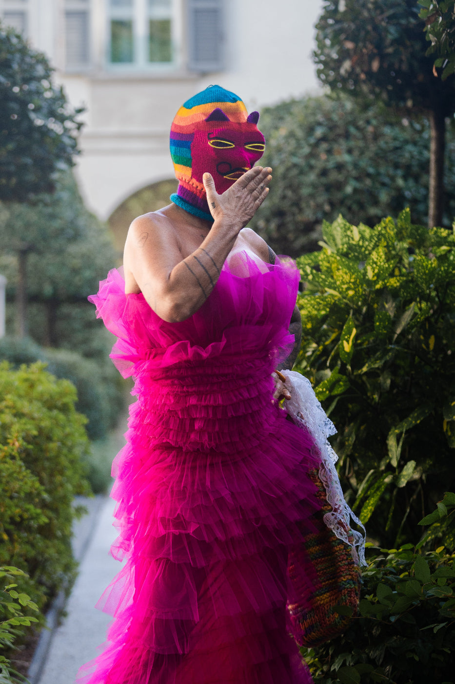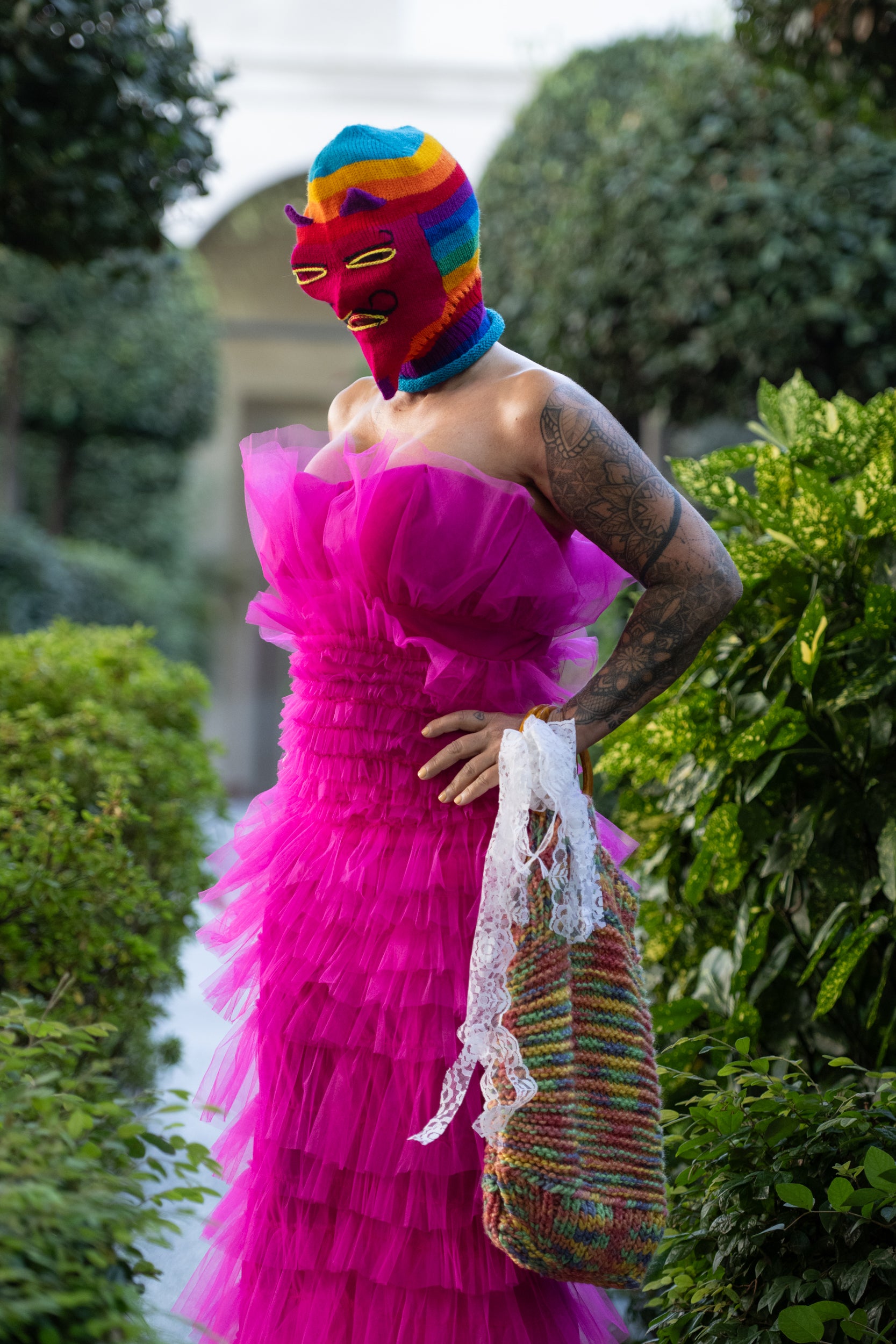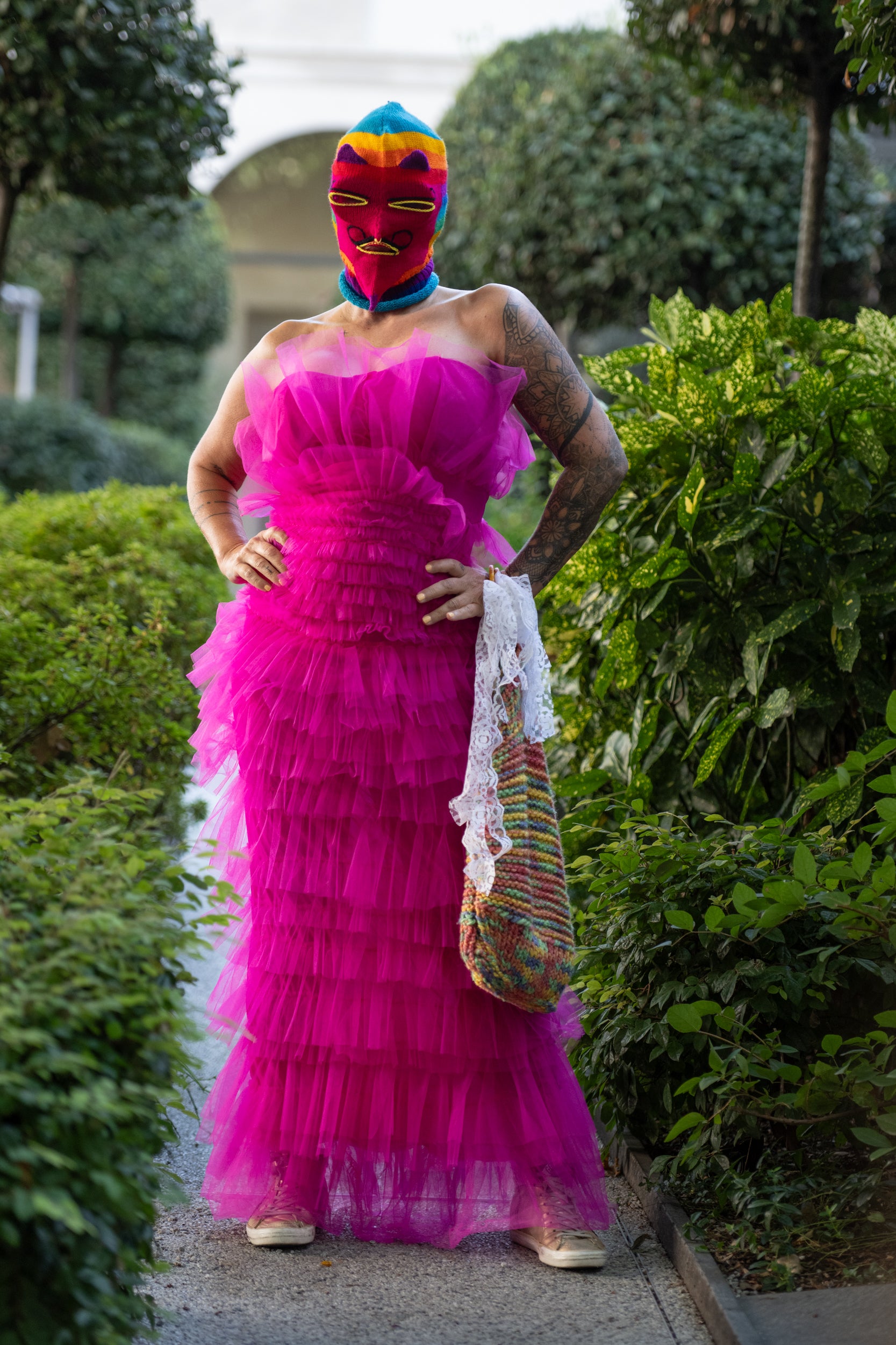Meta keywords: upcycled pink ruffle dress, avant-garde fashion, sustainable couture, bold statement dress, one-of-a-kind design, handmade in Berlin, New Zealand vintage, elastic off-shoulder dress, flamboyant pink gown, Paulina’s Friends couture.