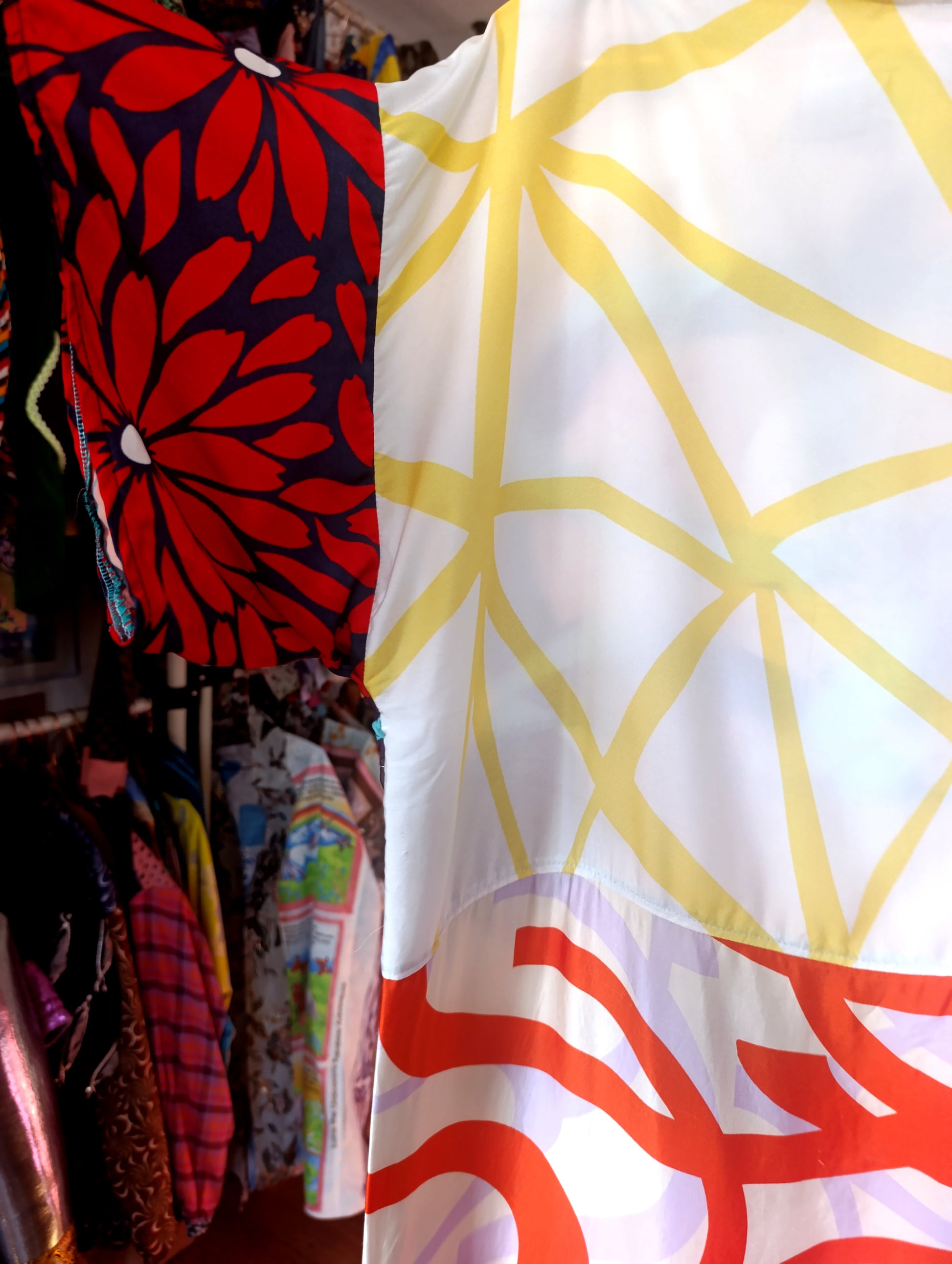 A sleek fusion of geometry and elegance. This short satin skirt features bold geometric patterns that catch the light with every move, creating a dynamic play between shape and sheen.