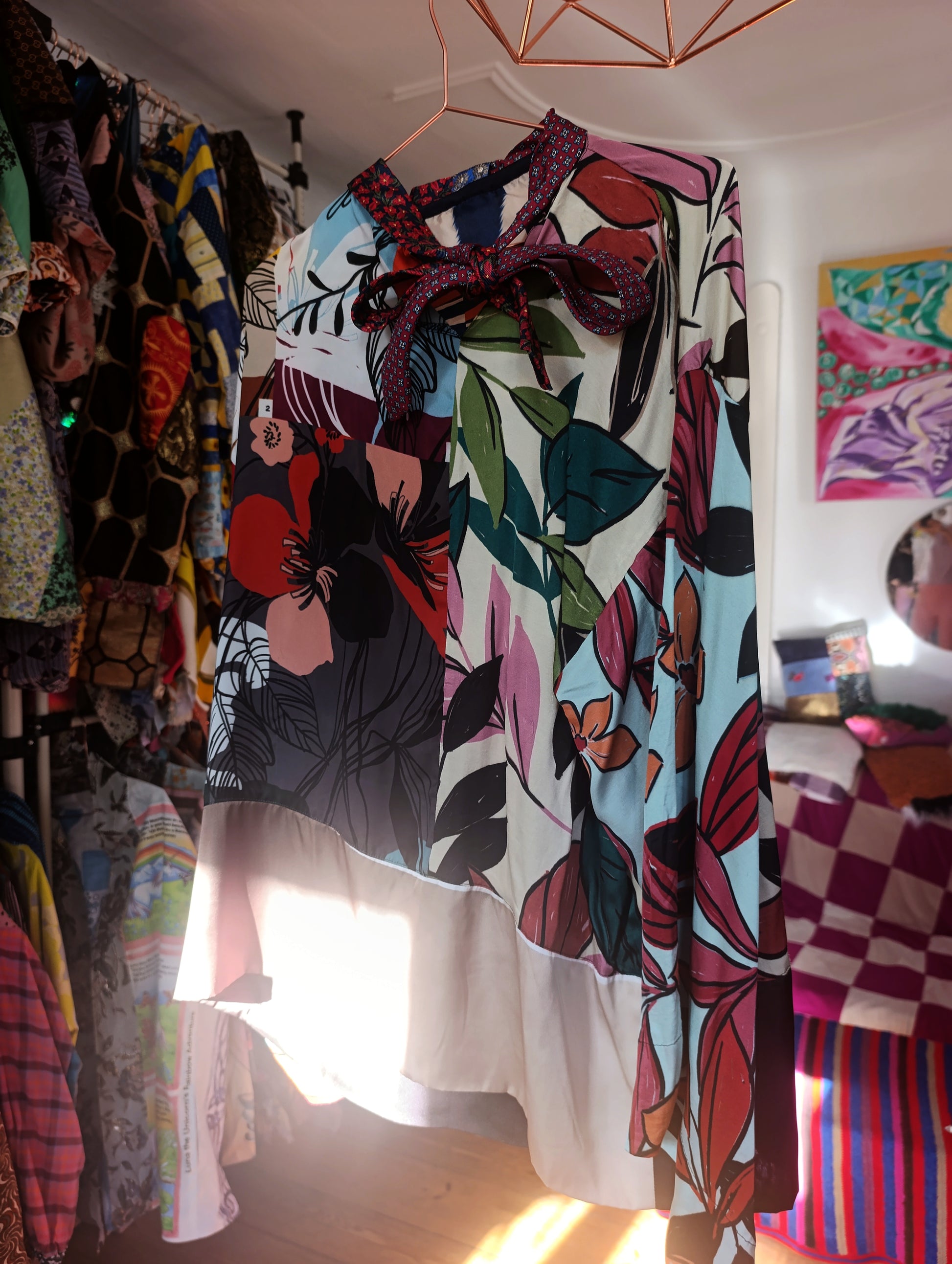 A statement of elegance and creative reinvention. This oversized blouse features a unique bow collar crafted from a vintage silk tie, transforming classic menswear into contemporary feminine couture.